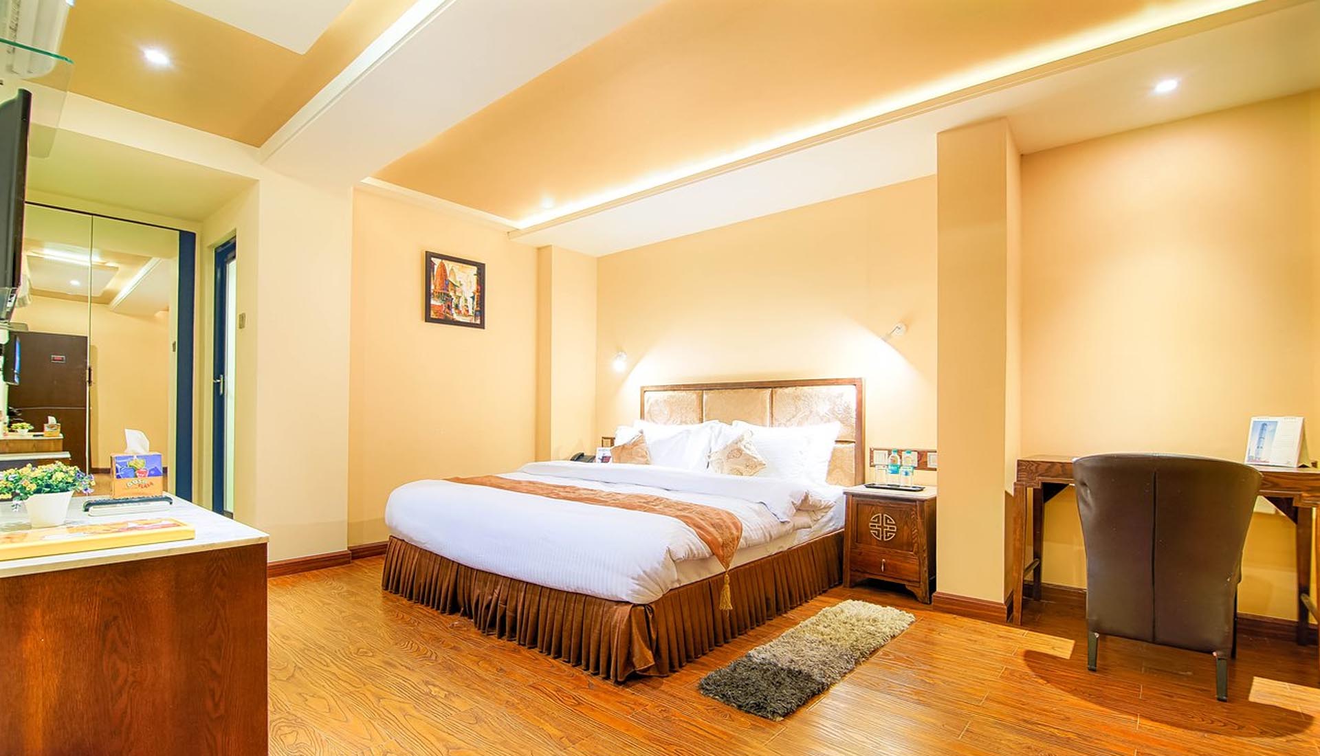 Heaven rooms are appointed with fine art & stylish furniture making it the best choice in the city for couples, families, friends, corporates & long stay guests. The rooms have a queen sized bed or twin bed that can be joined together creating a king bed. A third Guest may be accommodated with a rollaway and all of these rooms have a desk and en-suite bathroom with luxurious toiletries. These rooms are decorated with fine linen & exquisite brown wood picked from the teak forests of India. Our Heaven rooms provide deluxe room accommodation, coziness, & luxury combined in enhanced 240 square feet of space in the heart of the city.